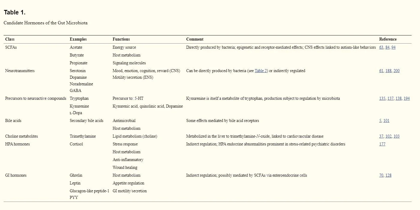 In 2014, scientist Gerard Clarke, along with his team, conducted a detailed observational study comparing the microbiome to the endocrine system called “Gut Microbiota: The Neglected Endocrine Organ” in which, through this comparative lens, they discovered the microbiota produces numerous chemicals of a hormonal nature that are released into the bloodstream (Table 1.)